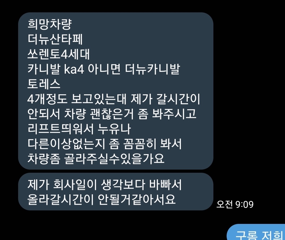 기아 더 뉴 카니발 출고 후기 🚘투투할부에서 진행한 실제 출고 사례를 소개합니다. 이번 고객님은 신용회복 절차 중 회차 미납 이력이 있어 심사 과정에서 어려움이 있었습니다. 기존 차량에 대출도 남아 있었기 때문에 상황은 결코 단순하지 않았습니다. 하지만 미납 건을 정리한 후, 다시 심사를 진행해 승인 가능한 최대 한도를 확보할 수 있었습니다. 고객님은 사업 일정상 직접 안산까지 방문하시기 어려워 차량 수색과 검증을 전적으로 저희에게 맡기셨습니다. 한정된 예산 내에서 최적의 차량을 찾는 것이 핵심 과제였습니다. 검수 과정에서 발견한 문제처음 검토했던 차량은 겉으로 보기엔 상태가 좋아 보였으나, 실물 검수 과정에서 시트 개조 사실이 확인되었습니다. 이런 차량은 자동차 검사 자체가 불가능해 향후 문제가 될 수 있습니다. 일부 업체에서는 이런 부분을 고객에게 알리지 않고 판매하는 경우가 있습니다. 그러나 저희는 모든 내용을 솔직히 안내드렸고, 해당 차량은 즉시 제외했습니다. 고객의 안전과 신뢰가 무엇보다 우선이기 때문입니다. 최종 선택된 차량추가 수색 끝에 고객님께 인도해드린 차량은 다음과 같습니다.